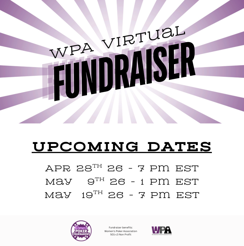 *If less than 35 participants, the main prize may be altered at the sole discretion of the Women’s Poker Association Board of Directors. Unfortunately, we are unable to roll over donations from one fundraiser event to another. Each event is distinct, with its own set of financial considerations. This helps us ensure that each event is properly funded and organized, allowing us to provide the best possible experience for all participants. Feel free to email admin@wpa.poker with any questions.
